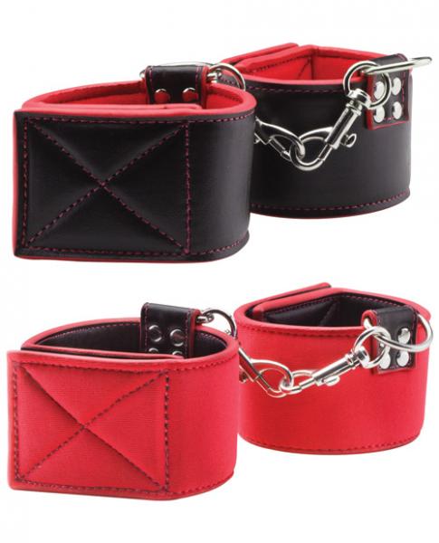 These cuffs are designed with a PU leather and a neoprene side, this allows you to choose the material you will feel on your skin by simply turning the cuffs around. The Neoprene side is colored and the leather side is black for a rougher look! Also they feature a Velcro lock which means they will fit almost everyone, and a snap-closure system to assure it's interchangeable with other bondage toys! <br /><br />Specifications: material side 1 Neoprene. Material side 2 polyurethane PU Leather. Diameter wrist cuffs 3.35 inches. Velcro locks. Metal snap closures. Dimensions 5.12 inches by 3.19 inches by 2.76 inches. From Shots America.