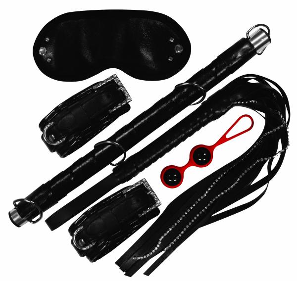 Sexperiments Bling and Sting Kit. The Bling and Sting kit will travel easily and offers something for everyone wanting to sexperiment. Create your own adventurous fantasy by slipping on the very soft and sturdy blindfold adorned with cubic zirconia crystals on each side. Blindfold on, lights out and your senses become enhanced. These soft, padded and comfortable cuffs come with a beautiful buckle lined with cubic zirconia crystals. Put on a pair of these fashionable and effective cuffs and you are ready to begin. The Spreader Bar and Crystal Whip add more excitement to your fantasy. The glass Kegal Balls add another dimension to your fantasy fun and allows your inner goddess be your guide. <br /><br />Includes: Bling Blindfold, Bling Cuffs, Crystal Whip, Spreader Bar, Glass Ben Wa Balls aka Kegal Balls. Materials: Nylon, elastic, vinyl fabric, polyurethane foam, polyurethane fabric, PVC binding, cubic zirconia, stannum, plastic polypropylene, plastic, nickel free metal hardware, aluminum, silicone, Pyrex glass, wood, copper.